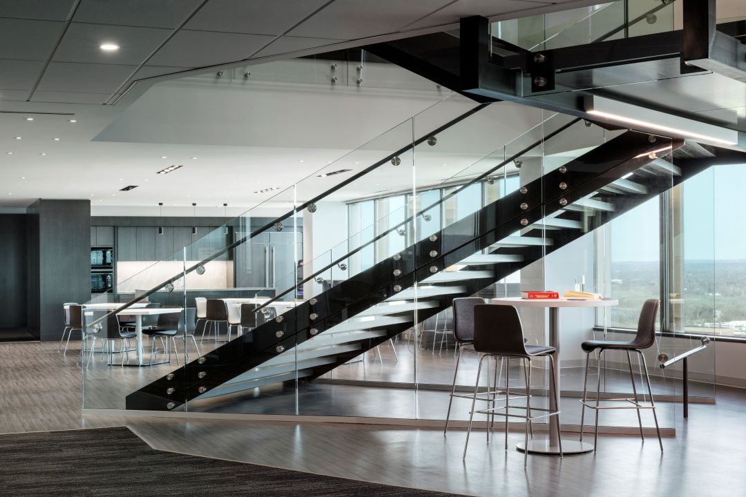 Virtus’ new, 65,000-SF HQ spans four floors of One Financial Plaza. The iconic Gold Building in downtown Hartford, offers 360-degree views for 220 employees. Stepping off the top floor elevator, a dramatic hallway with stacked stone and accentuated with specialty lighting leads your strategically toward a vast reception area flooded with natural light and spectacular views, Monumental stairs connect the main lobby and spacious café – a key amenity for staff.